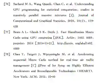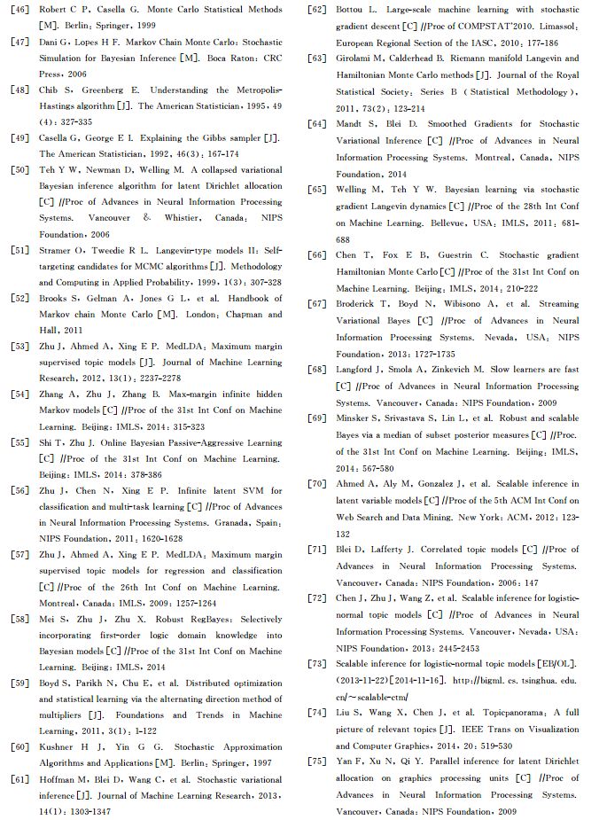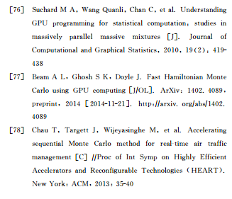 随着硬件的发展,使用图形处理器(graphics processing units, GPU)、现场可编程逻辑门阵列(field-programmablegate array, FPGA)等硬件资源对贝叶斯学习方法进行加速也是最近兴起的研究热点。例如,有研究者利用GPU技术对话题模型的变分方法[75]和MCMC算法[76-77]进行加速,还有一些研究者利用FPGA对蒙特卡洛算法[78]进行加速。利用强大的硬件设备,搭配适当的模型和算法架构,可以起到事半功倍的效果。