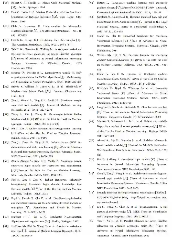 有很多贝叶斯模型都采用了MCMC的方法进行推理,取得了很好的效果[20,30,50]。除此之外,还有一类非随机游走的MCMC方法———LangevinMCMC[51]和Hybrid MonteCarlo[52]。这一类方法往往有更快的收敛速度,但是表述的复杂程度较大,因此受欢迎程度不及吉布斯采样,但是,最近在大数据环境下发展的基于随机梯度的采样方法非常有效,后文将会简要介绍。