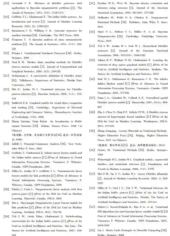 另外,对于有监督学习问题,非参数贝叶斯模型最近也受到了广泛的关注.例如,社交网络数据建模和预测是一个重要的问题,近期提出的基于IBP的非参数化贝叶斯模型[27,29]可以自动学习隐含特征,并且确定特征的个数,取得很好的预测性能。使用DP混合模型同时作聚类和分类任务也取得了很好的结果[38]。
