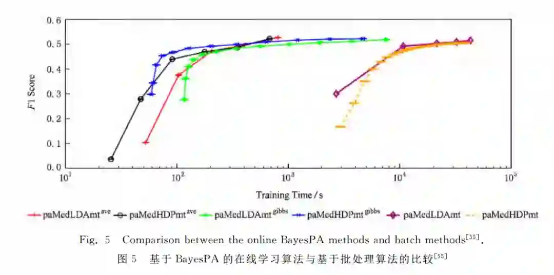 例1.为了适应动态流数据的处理需求,基于在线学习的大规模贝叶斯推理算法也成为近期的研究热点,主要工作包括流数据变分贝叶斯[67]等。我们近期提出了在线贝叶斯最大间隔学习(online Bayesian passive-aggressive learning, Online BayesPA )框架,显著提高了正则化贝叶斯的学习效率,并且给出了在线学习后悔值的理论界[55]。在100多万的维基百科页面数据上的部分实验结果如图5所示,可以看出,基于在线学习的算法比批处理算法快100倍左右,并且不损失分类的准确率。