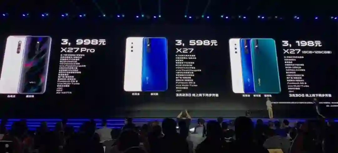 从现场发布的信息来看,vivo X27(8GB+128GB版)3月30日开售,价格在3198元;vivo X27(8GB+256GB版)价格在3598元;vivo X27 Pro 价格在3998元。