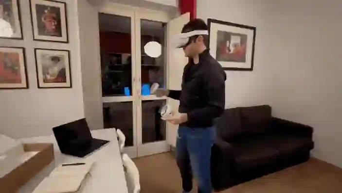 瞧,一位外国小哥头戴VR,手持设备,就开始了一通“谜之操作”: