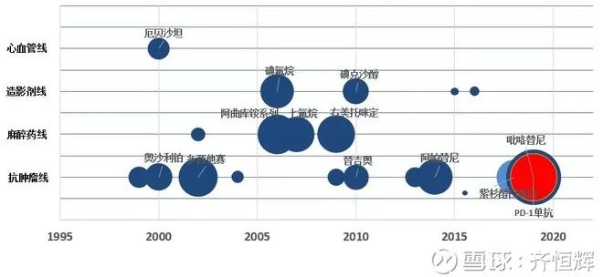 肿瘤药中扛鼎产品主要有多西他赛、奥沙利铂、伊立替康、来曲唑、亚叶酸钙、唑来膦酸、替吉奥、培门冬酶、卡培他滨、阿帕替尼、19K、紫衫除白蛋白、吡咯替尼;2013年上市的卡培他滨是个分水岭,之前的都是传统仿制肿瘤产品,之后的算是有创新的产品;
