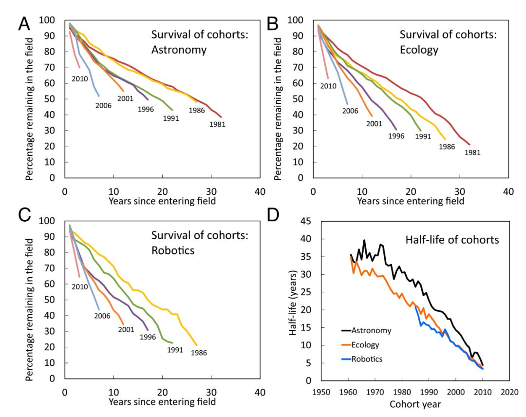 图源:pixabay.com 撰文 | 计永胜责编 | 陈晓雪●●● 2018年12月11日,《美国科学院院刊》(PNAS)发表的一篇文章显示 [1],科学家的 “半衰期” (一半人离开科研界)从1960年的35年缩短到2010年的5年。也就是说,科学家 “逃离” 学术界的速度在加快。同时,越来越多 “仍在坚守” 的科学家不能从研究辅助角色(Supporting authors)转变为领导角色(Lead authors)。这篇题目为“科学职业人群结构变化:短期从业人员数量增加”(Changing demographics of scientific careers:The rise of the temporary workforce)的文章由印第安纳大学教授米洛杰维奇(Staša Milojevic)、拉蒂奇(Filippo Radicchi)和佐治亚理工学院沃尔什(John P. Walsh)联合撰写。 该研究系统分析了1960年以来天文学、生态学和机器人学科领域科学家的学术论文发表规律和最终的职业 “幸存率”。 研究指出,当代科学研究已经从过去小团队式的单打独斗模式转变为分工明确、角色清晰的集团化操作。虽然后者更有助于科研成果的产出,但也 “可能使某些领域担任辅助角色的研究人员(supporting researchers)饱受职业不稳定的困扰,不利于他们的长远职业发展”。 图1. 天文学、生态学和机器人学科科研人员“幸存率”和半衰期曲线。(图源:参考文献1) 应该说,米洛杰维奇团队的研究是对科学家群体近几十年的生存状态进行了分析。 2019年9月3日,美国地球物理学联合会(American Geophysical Union)的共享科学项目高级专家、生物学家汉隆(Shane M Hanlon)在 PNAS 发表评论文章,对米洛杰维奇团队研究中关于科学家的定义提出了不同看法 [2]。 汉隆表示,米洛杰维奇文章中所用的表述可能会阻碍读者理解作者本想表达的意思。例如,文章题目将 “短期从业人员”(temporary workforce)定义为 “离开学术界的任何人员”,而在文中, “短期从业人员” 又类同于 “短期科学家” (temporary scientists);文章对一些词汇的定义同样有待商榷:作者对科学家职业仅限定在科研人员群体,只统计了科研领域的科学职业 “幸存率”,只将近20年发表多篇论文的人定义为全职科学家,而离开学术界(academia)就意味着从科学家队伍退出(dropout)…… 汉隆指出,有些科学家在离开科研领域后依然从事科技交流和科学传播的相关工作,在一些情况下,他们发表的文章(可能不是学术论文)甚至比专职科研人员还要多。所以,终止科研工作的科学家并不意味着他们不再是科学家,因为他们可能通过其他途径为科学事业做贡献。 针对汉隆的评论,米洛杰维奇团队在同期 PNAS 进行了回应 [4]。该团队首先明晰了研究中对 “科学家” 的定义,即 “为科学知识整体做出贡献以及参与科学(期刊)交流的个人” [5]。根据该定义,科学家不仅包括大学中的科研人员,还包括在政府实验室、工业实验室等部门从事科学研究并定期发表学术论文的工作人员 [6]。 米洛杰维奇团队在回应文章中承认,从事课堂教学、行政管理以及就职于工业界的科学家为科学事业做出了贡献,同时指出该团队的研究只是描述当前学术界论文发表的持续时间缩短,科研团队 “辅助人员” 增多的现象,并无意于对科学家进行定义。 米洛杰维奇团队最后指出,科学家从科学相关领域向科学非相关领域转换的现象会更加普遍,并且时间会更加提前,而该团队的发现和汉隆的评论都提示,未来需要界定这种角色转变对科研生态的影响,及时发现问题并敦促政策制定者采取有效的干预措施。 其实,汉隆和米洛杰维奇团队对 “科学家” 定义只是广义和狭义之分。汉隆所谓的 “科学家” 更像是中文语境中的 “科学工作者”。值得一提的是,争论双方都积极肯定了教学、行政和企业研发人员在科学知识传播、科研运行管理及科技成果转化等方面所做的的贡献。如果我们把科学事业看做一个系统工程的话,那么科学家就应该包括科学知识的创造者、传播者和转化者。因此,只要是秉承科学思维,传播理性声音,促进科技发展的专业人士,都可以被认为是科学家。 参考文献:[1] S. Milojevi´c, F. Radicchi, J. P. Walsh, Changing demographics of scientific careers: The rise of the temporary workforce. Proc. Natl. Acad.Sci. U.S.A. 115, 12616–12623 (2018).[2] Shane M. Hanlon, Scientists who leave research to pursue other careers in science are still scientists. Proc. Natl. Acad. Sci. U.S.A. 116, 17624 (2019).[3] E. A. Cech, M. Blair-Loy, The changing career trajectories of new parents in STEM. Proc. Natl. Acad. Sci. U.S.A. 116, 4182–4187 (2019).[4] S. Milojevi´c, F. Radicchi, J. P. Walsh, Transitions in science careers. Proc. Natl. Acad. Sci. U.S.A. 116, 17625–17626 (2019).[5] Y. Xie, K. A. Shauman, Women in Science: Career Processes and Outcomes(Harvard University Press, Cambridge, 2003).[6] S. Stern, Do scientists pay to be scientists? Manage. Sci. 50,835–853 (2004). 制版编辑|皮皮鱼