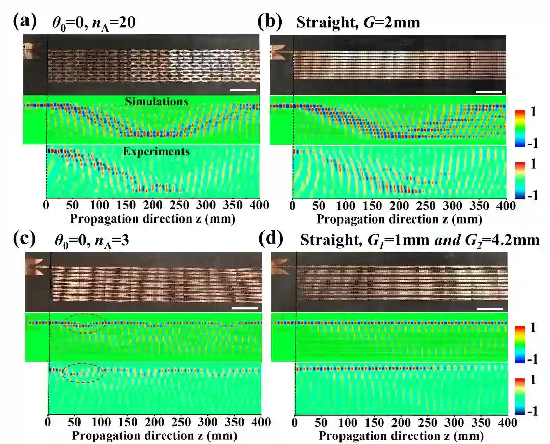 图一:(a)高频驱动的周期性弯曲波导阵列与光场演化;(b)均匀静态的波导阵列与光场演化;(c)Floquet波导阵列与光场演化;(d)静态拓扑波导阵列与光场演化。