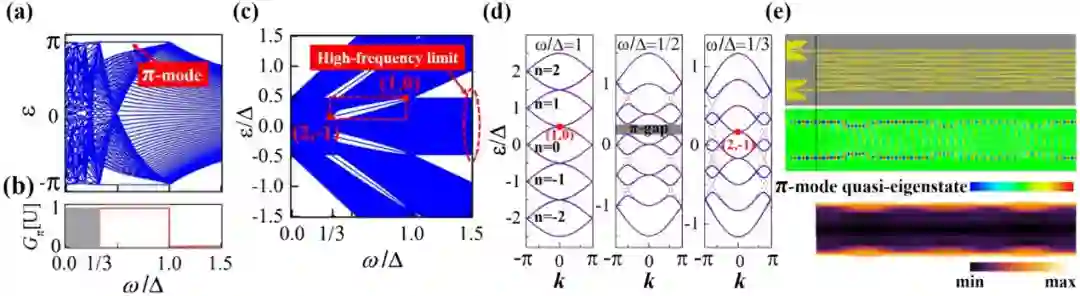 图三:(a)Floquet哈密顿量取开边界条件时的准能带;(b)拓扑不变量Gπ[U];(c)Floquet哈密顿量的准能带;(d)动量空间中准能带经历闭合(ω/Δ=1/3)-打开(ω/Δ=1/1)-闭合(ω/Δ=1);(e)Floquet π模的场分布。