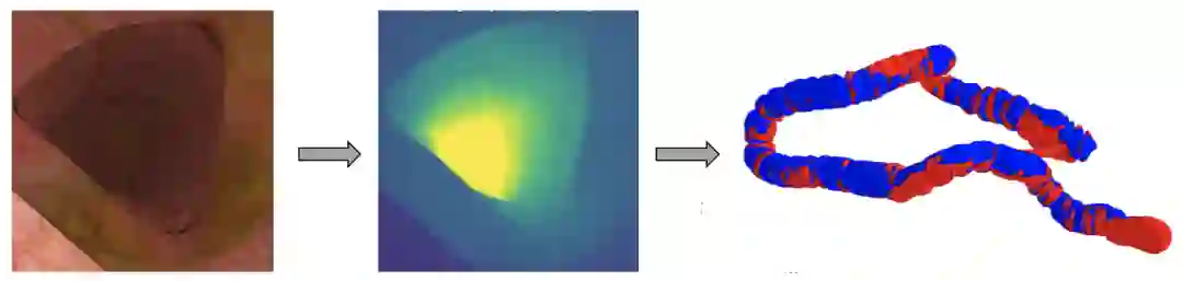 ML 系统通过单个 RGB 图像(左)来计算深度图像(中)。然后,根据视频序列的深度图像计算结果,计算出局部覆盖率(右),并检测出覆盖率不足且需要再次查看的区域(蓝色表示观察到的部分,红色表示未覆盖的部分)。您可以在我们之前发表的文章中了解有关此项研究的详细信息