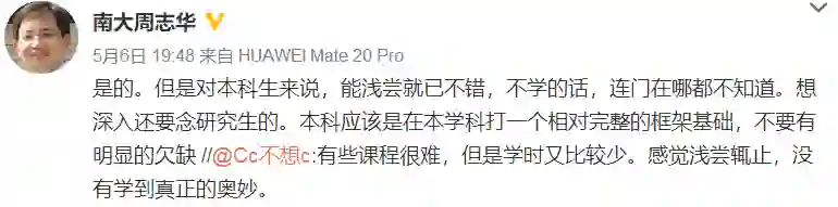 对此,周志华院长表示:是的。但是对本科生来说,能浅尝就已不错,不学的话,连门在哪都不知道。想深入还要念研究生的。本科应该是在本学科打一个相对完整的框架基础,不要有明显的欠缺