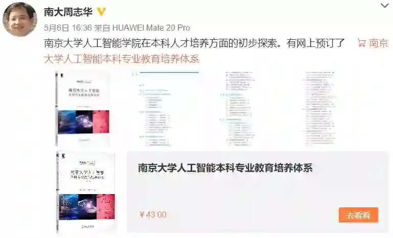 5 月 6 日,人工智能学院院长周志华教授在微博上分享了《南京大学人工智能本科专业教育培养体系》,这是南京大学关于培养高质量人工智能人才的思考和实践。