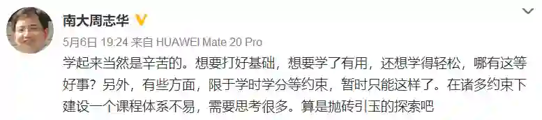 此外,周志华院长还表示学起来当然是辛苦的。想要打好基础,想要学了有用,还想学得轻松,哪有这等好事?另外,有些方面,限于学时学分等约束,暂时只能这样了。在诸多约束下建设一个课程体系不易,需要思考很多。算是抛砖引玉的探索吧
