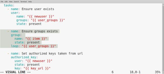 使用 Ansible 剧本或 YAML 文件时,缩进很重要。高亮显示的块可以使用 > 和 < 键向右或向左移动。