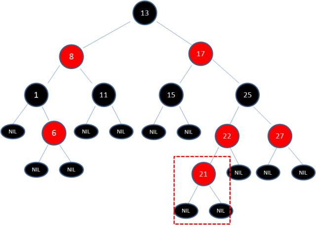 下图所表示的是红黑树的一部分,需要注意节点25并非根节点。因为节点21和节点22连续出现了红色,不符合规则4,所以把节点22从红色变成黑色: