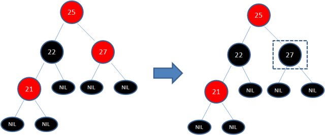 此时仍然没有结束,因为节点25和节点27又形成了两个连续的红色节点,需要继续把节点27从红色变成黑色: