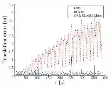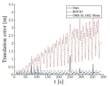 7、 如图7所示,论文比较了基于本文的算法,ROVIO和ORBSLAM2相对于vicon的位置误差。
