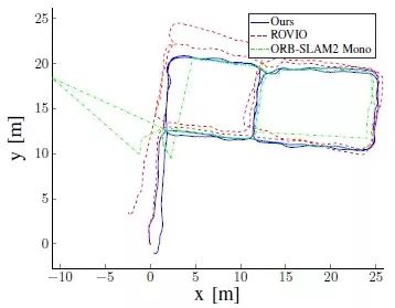 2、基于本文的算法、ROVIO视觉 - 惯性里程计算法和ORB-SLAM2视觉SLAM算法估计所得的轨迹在x-y平面上的对比结果,如图2所示。