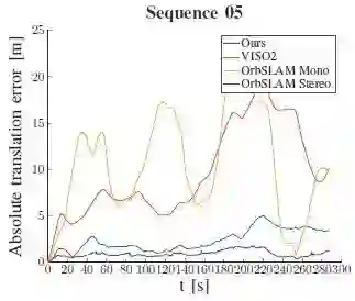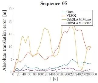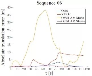 8、本文在里程计因子中将预先积分的惯性相对姿态替换为VISO获得的相对姿态。图8给出了基于KITTI 05序列, 本文的算法,VISO、单目ORB-SLAM2和立体相机ORB-SLAM2计算所得相对于真实位置的绝对位置误差随时间的变化。应用于序列06的结果,如图9所示。