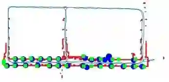 4、基于本文算法得到的顶层上的估计轨迹的部分被叠加在图5中的部分真实图(两者手动对准)上。基于本文算法得到的估计轨迹(蓝线)和估计的门位置(蓝色圆圈),覆盖到部分地面实况图(红色)以及地面真实门位置(绿色方块)。
