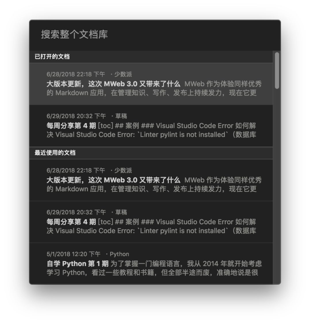 MWeb 本身提供了文档库功能,你可以把所有在写的文章、临时记录的心得、随时要反复查询的笔记等内容通通储存到 MWeb 里,所以我们的 MWeb 中往往是一个巨大的文档库。如果你想要在这些茫茫文档中立即找到一篇旧文档,不一定是一件简单的事情。而借助 3.0 新增的快速搜索功能,它的界面跟我们熟悉的启动器应用,比如 Spotlight、Aflred 等非常相似,我们只需要按下快捷键 ⌘Command-O,在弹出的界面中输入文档标题或者内容,就能立即进行检索,找到想要的内容。