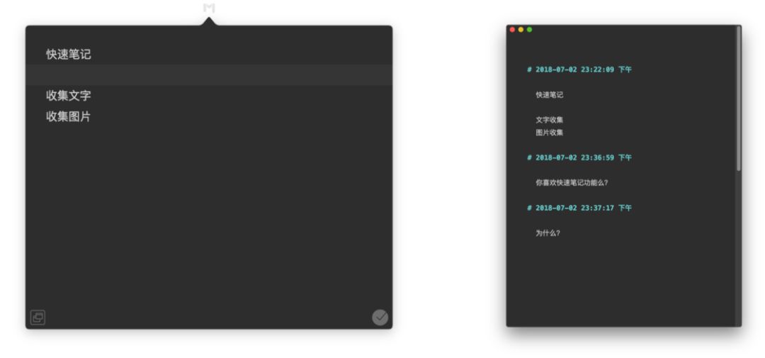 快速笔记位于 Mac 菜单栏上,启用后,点击图标即可输入。你可以选择每隔一天、三天、七天、十四天新建一个文档,在这个间隔时间内输入的内容,会保存在同一篇文档内,点右下角对勾就会将时间戳和内容保存至文档。
