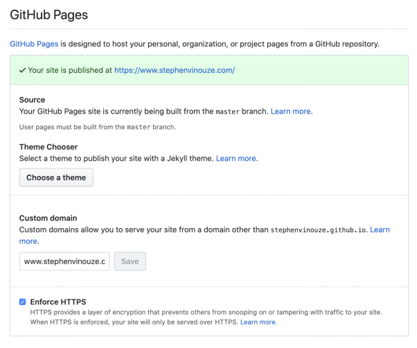 GitHub Pages可以让你指定自定义域名。对于我的网站来说,所有访问http://stephenvinouze.github.io/的都会被重定向到https://www.stephenvinouze.com/。