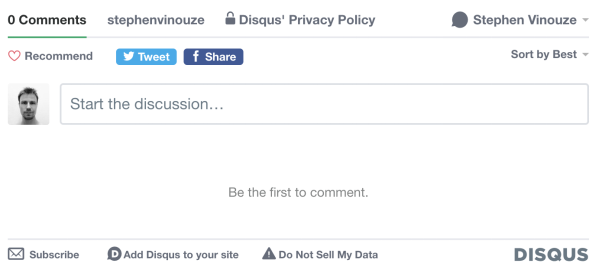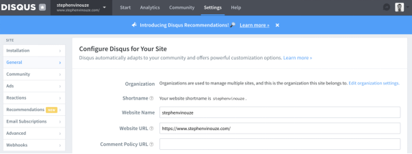 下面的截图中可以看到我的网站Disqus配置。在我的_config.yml文件中,我将Disqus值设置为stephenvinouze: