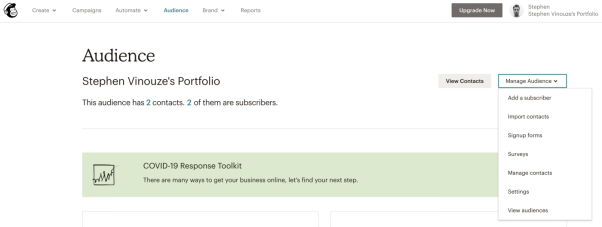 选择“Audience”。右侧面板有一个“Manage Audience”。打开它,然后点击“Signup forms”。