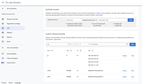 保存这些设置,然后进入Google Domain的控制台。在“DNS”小节中,用你的记录替换自定义记录。可以参考这篇文章(https://medium.com/@hossainkhan/using-custom-domain-for-github-pages-86b303d3918a)。
