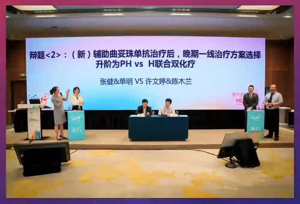 最后的重磅环节是乳腺癌规范化诊疗热点辩论,由徐兵河教授和潘跃银教授担任主持。辩论赛主要包括立论、自由攻辩和总结陈词三大部分,正反双方各由2位选手抽签组队,相互协作。