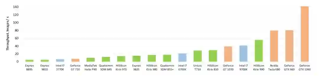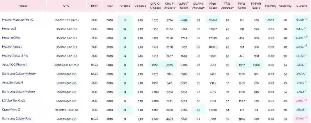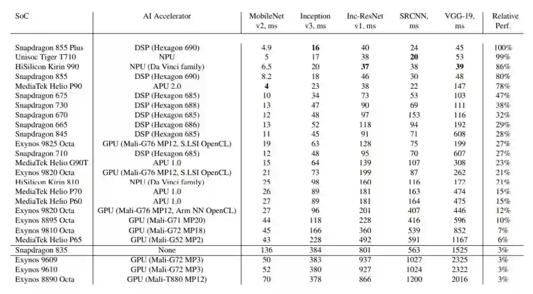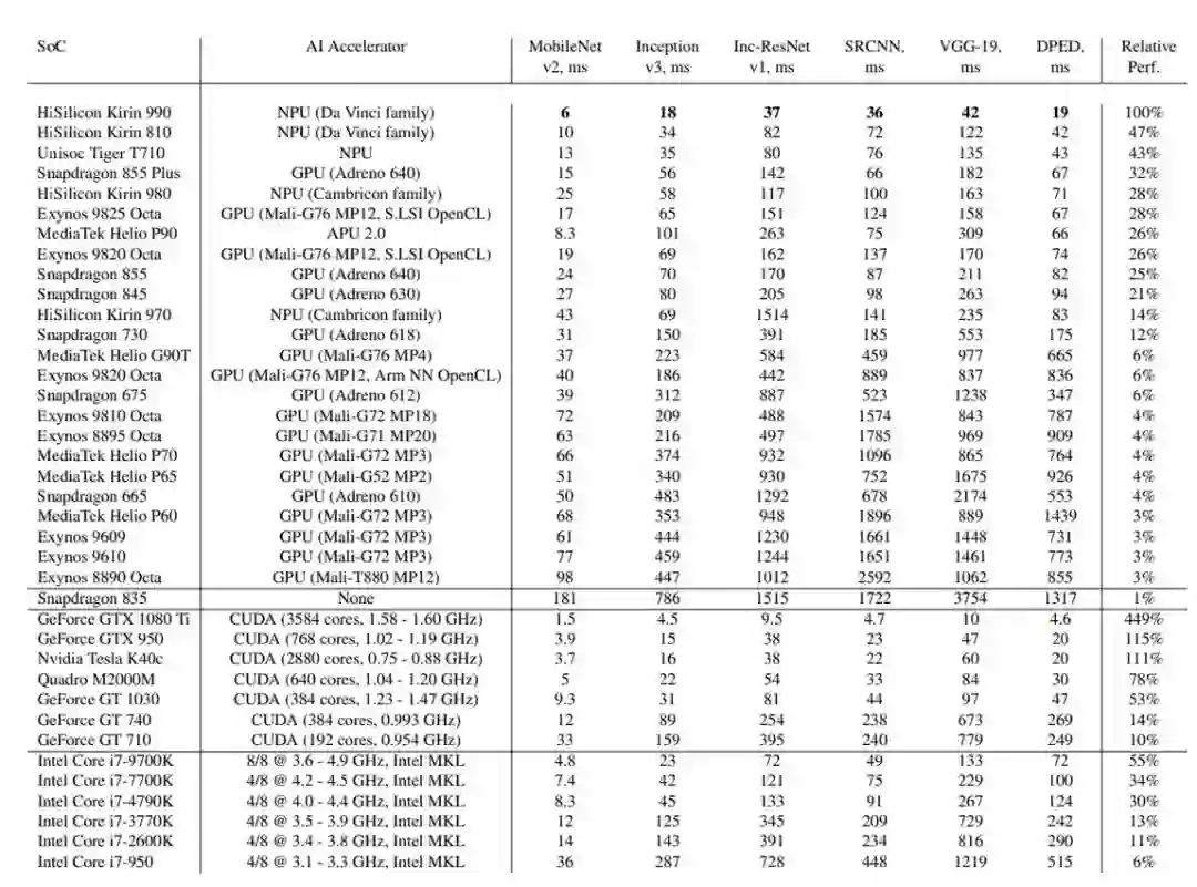 为了测试移动设备芯片的深度学习性能,瑞士苏黎世联邦理工学院去年开发了一款名为 「AI Benchmark」的应用,对多款搭载深度学习加速芯片的移动设备进行基准测试。最近,AI Benchmark 已经更新到了 3.0,研究者也发布了最新的测试结果。报告显示,麒麟 990(5G 版)的 AI 性能远超高通骁龙 855+,性能甚至接近常见云服务 GPU 英伟达 Tesla K80 的四分之三。
