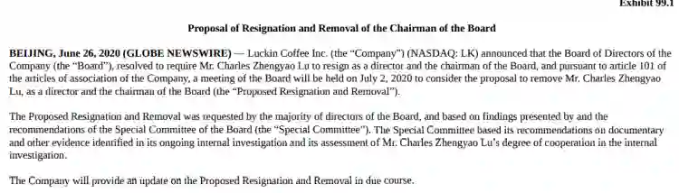 就在撤销听证会的告示发布之后,6月27日凌晨瑞幸又在SEC提交了一份神奇的公告:董事会的多数成员提议在7月2日举行董事会,罢免董事长陆正耀。同时,董事会的多数成员也建议在另一场即将举行的股东会上,股东们应投票反对罢免独立调查组负责人邵孝恒。