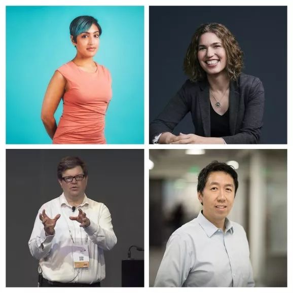 从左到右依次是:埃森哲 Responsible AI 全球计划负责人 Rumman Chowdhury、Cloudera 机器学习负责人 Hilary Mason、Facebook AI 研究院创始人 Yann LeCun、谷歌大脑联合创始人吴恩达。