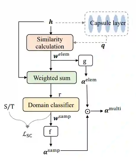 (a)domain-q:q是可训练的领域向量,领域内所有的元素共享q;(b)sample-q:q是从每个样本抽出的领域相关的特征,每个样本内部的元素共享q,这里我们使用胶囊网络(capsule network)来抽取这个特征。通过计算隐层与领域表示的相似性得到元素级的领域相关性。