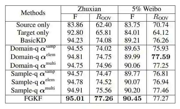 我们使用F1-score和OOV recall来评价在中文分词领域适应上的表现,我们比较了不同的领域表示方案和不同层次的知识融合方案,结果见表3。可以发现在领域表示的层面上,样本级别的领域表示(Sample-q)好于领域级别的领域表示(Domain-q),在知识融合的层面上,多层级的方式好于元素层面的融合,也好于样本层面的融合。我们最终的方案为基于样本级别领域表示的多层次知识融合方法(FGKF)。