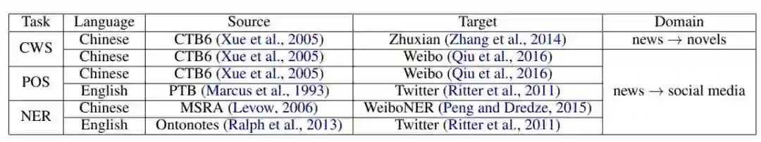 我们在两种语言,三个任务上复现了序列标注领域适应的相关工作,我们的方案均获得了最好的结果。