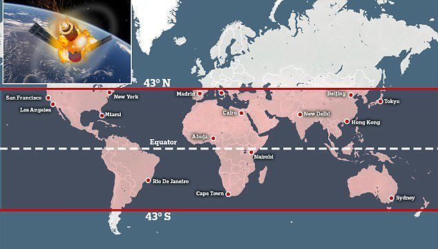 某外媒渲染的天宫一号可能坠落区,其实就是天宫一号轨道(倾角43°)的运行地面轨迹