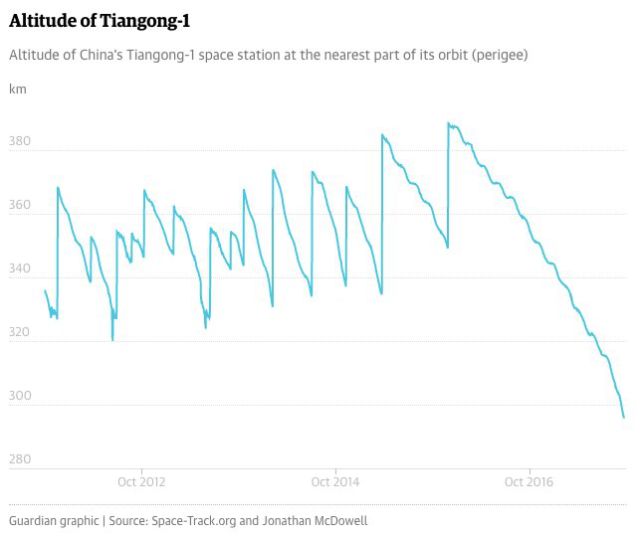 天宫一号的轨道高度变化图,可以看到轨道高度一旦缺乏控制就会在空气作用下逐渐降低。自2016年起我国中止数据连接后,天宫一号进入最终返回地球阶段,预计将在2018年2月份前后返回地球 。(图片来自Space-track.org)