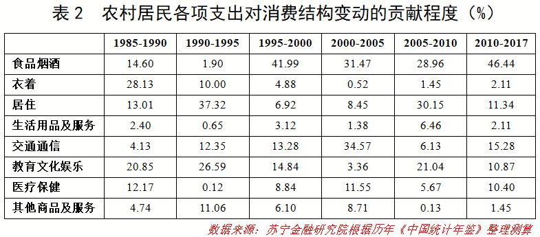 我们依然可以从数据中洞悉。基于前文的测算,进一步分析不同阶段城乡居民消费结构的变动,究竟是由哪些支出的变化所引起,这可以通过不同支出项目对消费结构变动的贡献率来衡量。按照《中国统计年鉴》的统计口径,居民消费支出项目主要包括食品烟酒、衣着、居住、交通通信等八大领域。