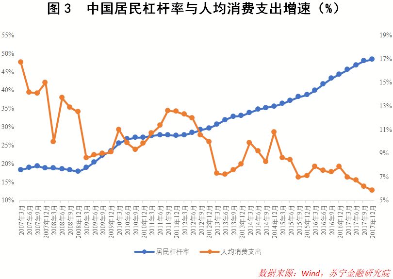面对住房领域高企不下的大额刚性支出压力(比如房贷、租金等),人们势必要在其他消费项目上节流,这便制约了居民消费升级的步伐。数据显示,中国居民部门杠杆率(居民债务占GDP比重)从2008年的18%上升到2017年的49%,与之形成对比的是,居民人均消费支出增速的回落(参见图3)。
