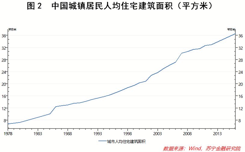 从数据上看,我国城镇居民人均居住面积从1998年的18.66平米上升到2016年36.6平米(参见图2),接近翻一番,城乡居民的居住消费支出占总支出的比重,则由1998年的9.43%和15.07%上升至2017年的22.76%和21.48%。