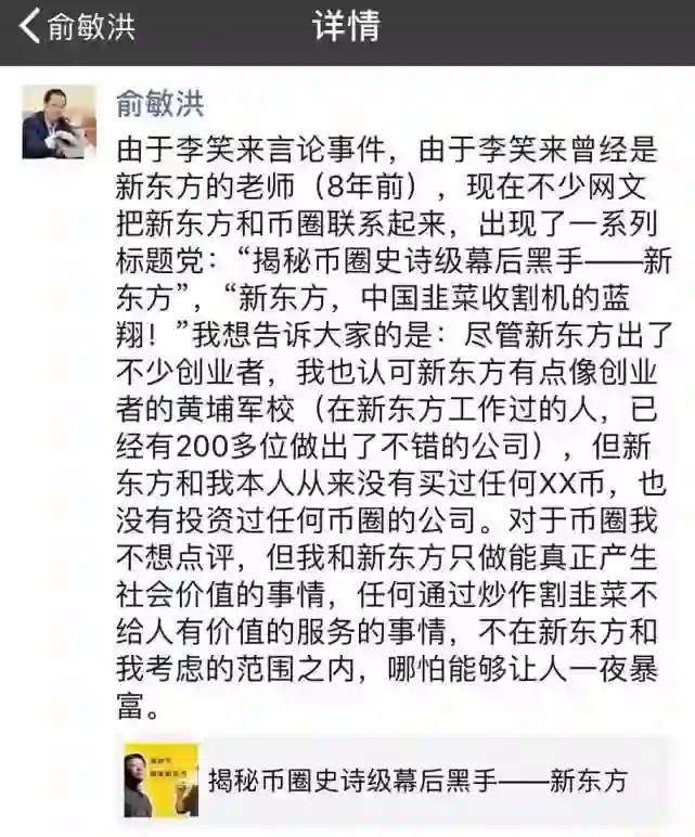 由于李笑来8年前曾在新东方任老师,因此关系,现在有网络言论指称“新东方是中国韭菜收割机的蓝翔”,对此俞敏洪昨日发朋友圈表示,“尽管新东方出了不少创业者,我也认可新东方有点像创业者的黄埔军校,但新东方和我本人从来没有买过任何XX币,也没有投资过任何币圈的公司。”