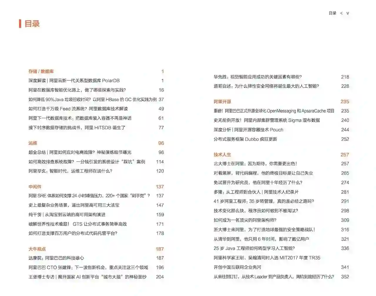 从业界前沿的算法、机器学习、大数据等最新技术,到行业标杆的数据库、中间件、运维、安全、移动开发等成熟技术,再到阿里开源技术、大牛观点分享,涵盖了阿里巴巴所有技术兵种。