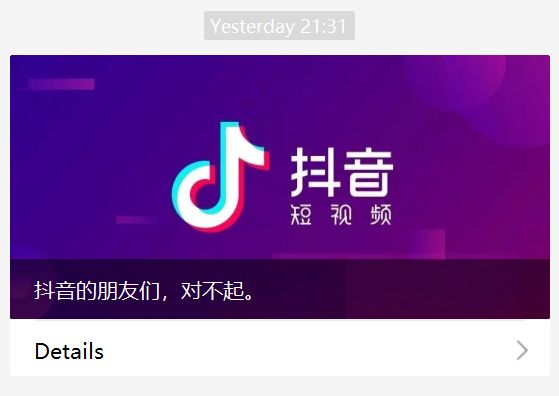 5月21日,“微信派”发布《关于升级外链管理规则的补充公告》,明确规定“外部链接不得在未取得信息网络传播视听节目许可等法定证照的情况下,以任何形式传播含有视听节目的内容。”其中,抖音、快手、微视等软件均受影响。