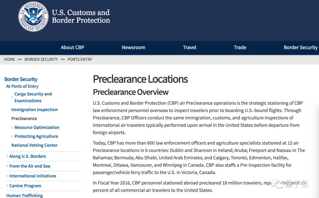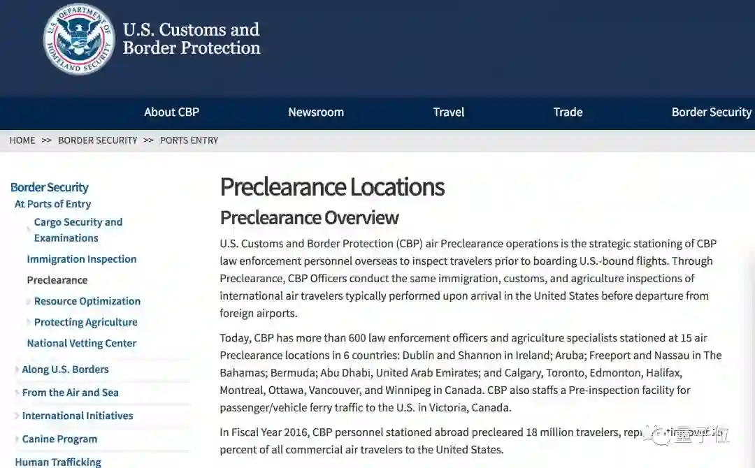 美国海关官网显示,早在2017年,美国海关就已经在6个国家的15个航空预检点设置了预海关检查,包括爱尔兰、阿鲁巴岛、巴哈马、百慕大群岛、阿拉伯联合酋长国和加拿大。