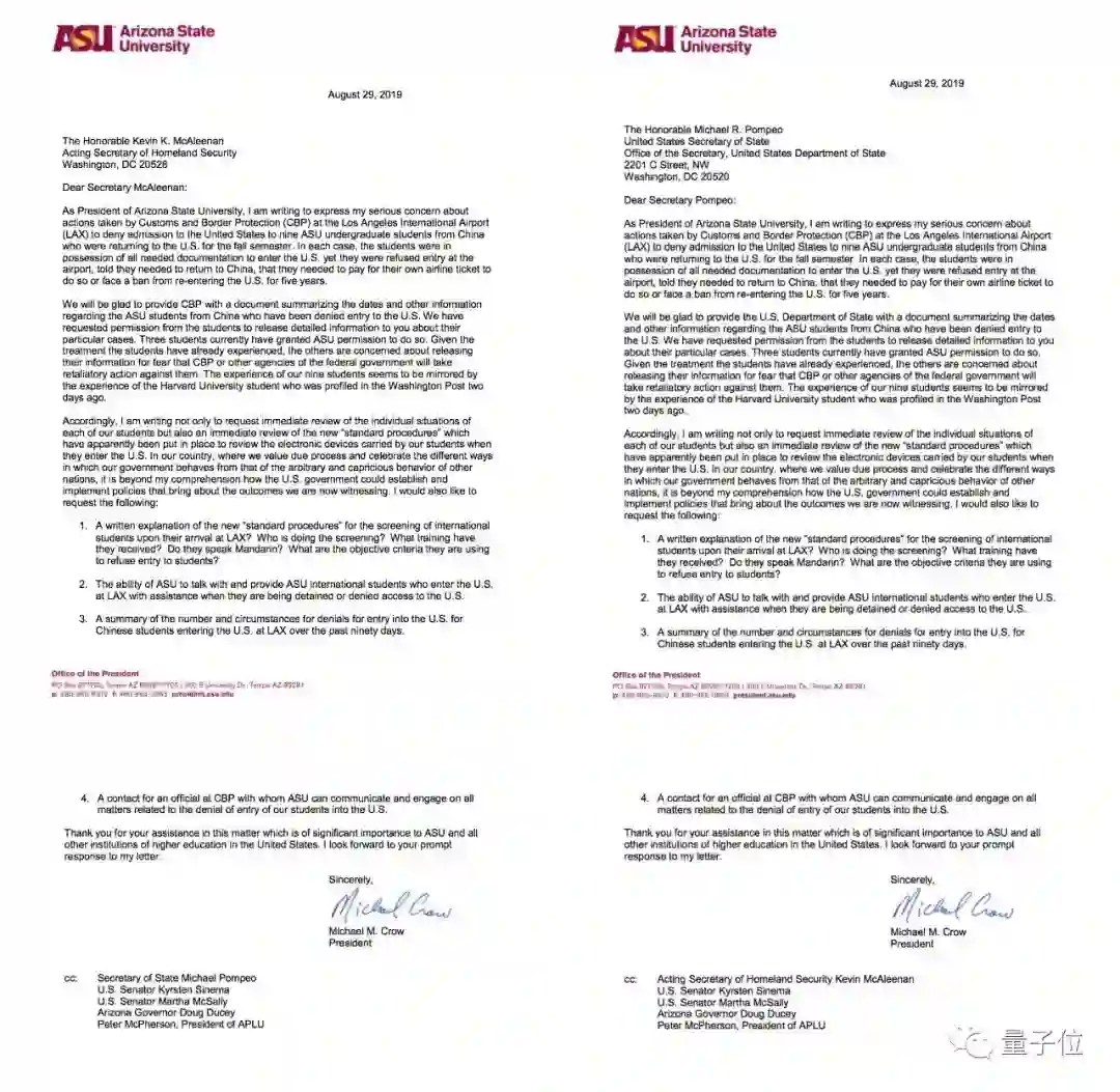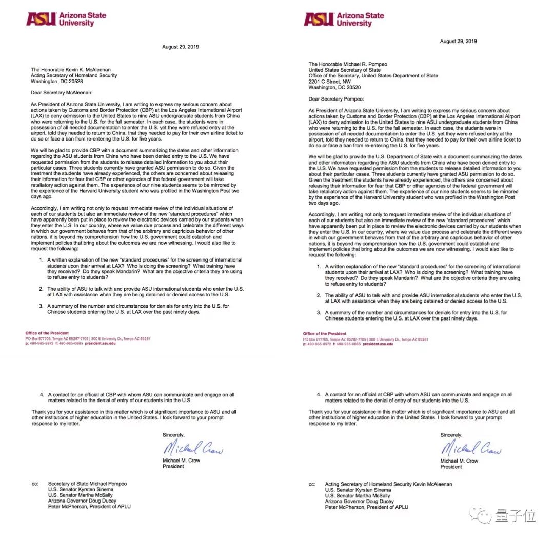 8月30日,亚利桑那州立大学确认事情属实。其校长Michael Crow迅速给美国国土安全部部长凯文·麦卡利南(Kevin McAleenan)和美国国务卿迈克尔·蓬佩奥(Michael Pompeo)分别去信,两封信的正文基本是一样的。