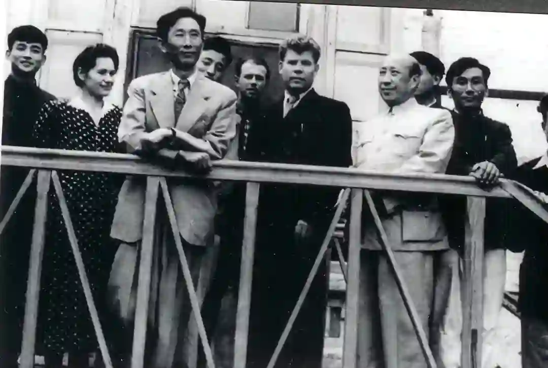 1956年7月,中苏合作黑龙江流域综合考察队小兴安岭地质队在勃拉戈维申斯克(海兰泡)同苏方商谈工作计划后,当地政府领导同中方人员一起。中方右起:姜春潮、侯德封(地质研究所所长、小兴安岭地质队学术指导)、叶连俊(地质研究所沉积室主任、小兴安岭地质队队长)、孙枢