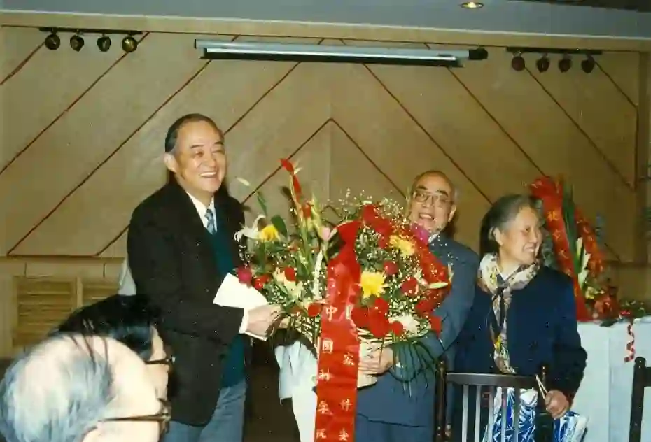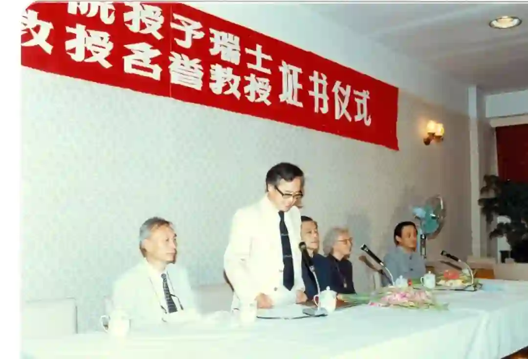 中国科学院授予许靖华名誉教授仪式(1985),左起:顾以健(时任院秘书长)、许靖华、孙鸿烈副院长、许靖华夫人、孙枢。