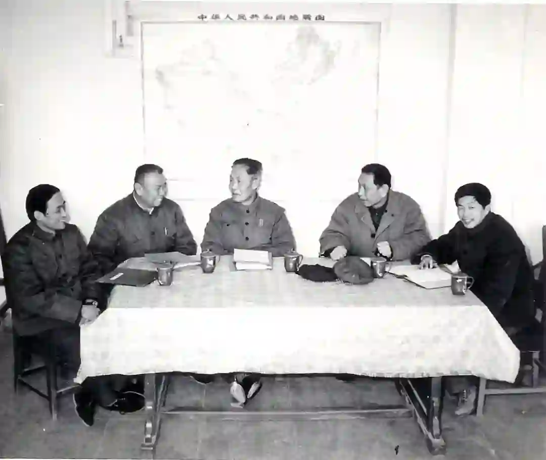 1980年张文佑院士(中)担任中国科学院地质研究所所长时的领导班子,右起:孙玉科(副所长)、沈力(常务副所长)、霍清源(党委书记)、孙枢(副所长)。