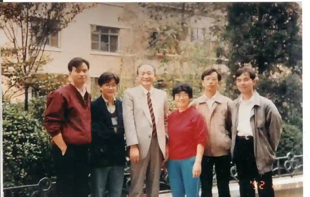 同研究生们在一起(1992),左起:肖文交、侯泉林、孙枢、谢翠华、李培军、任胜利。