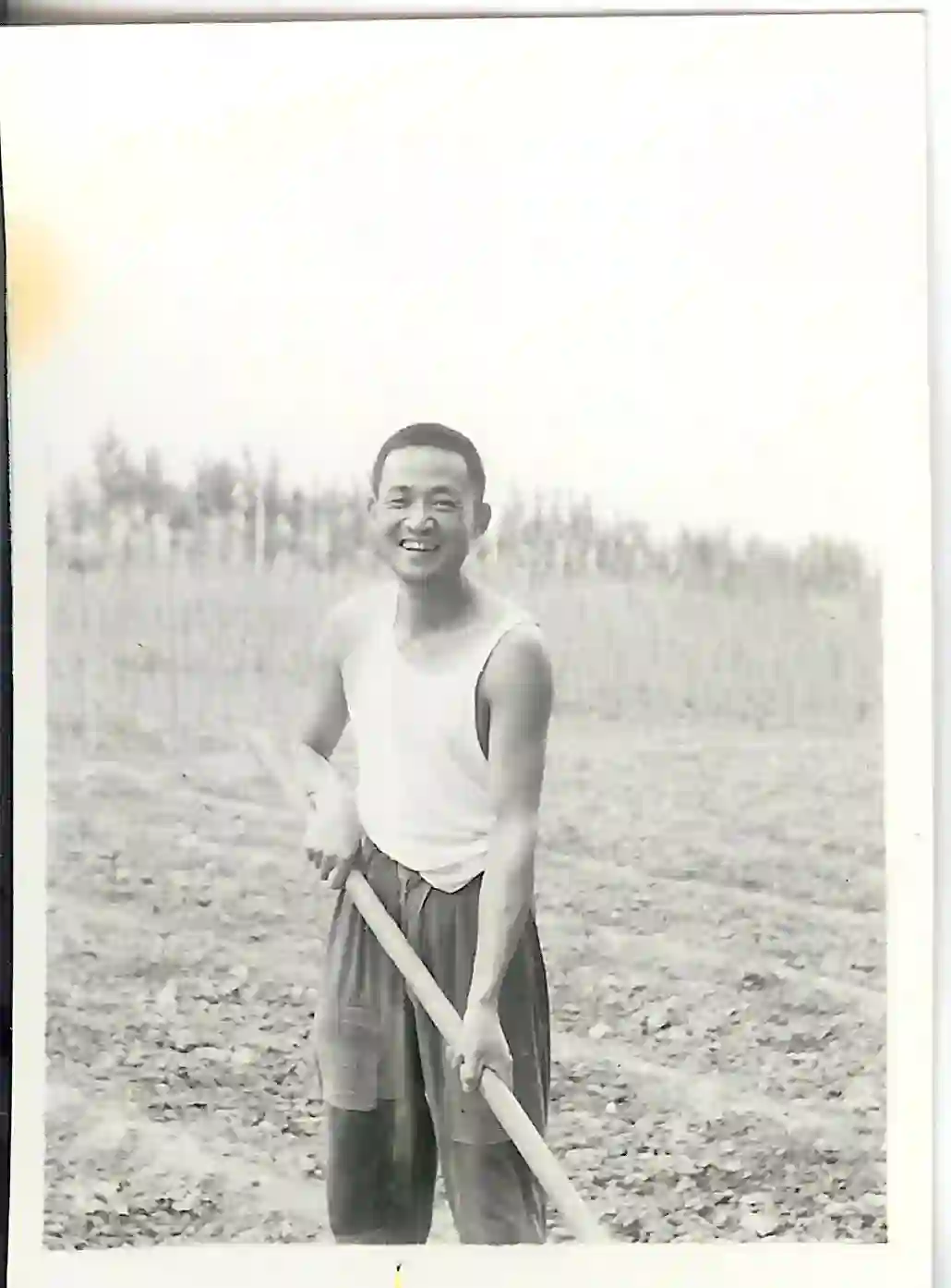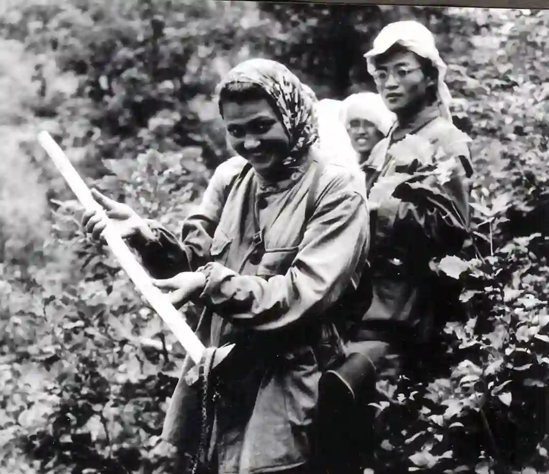 在苏联小兴安岭浓密的灌木丛中进行考察时,头戴防蚊帽,苏联助手尼娜打死了一条蛇,注意当时苏联的地质锤是长柄的。