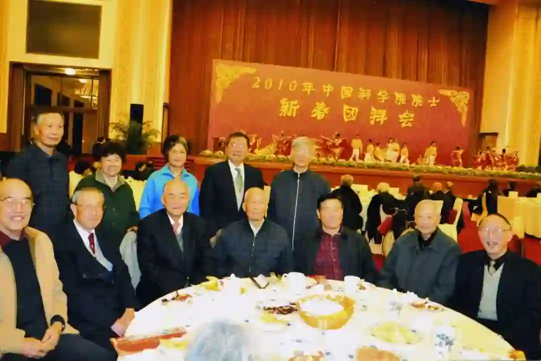 2010新春大聚会,前排右起:殷鸿福、於崇文、赵鹏大、田在艺、孙枢、李德生、翟裕生;后排右起:戴金星、王铁冠。